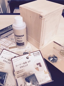 ☆材料:ベニヤ板端材、水性ニス、コーナー金具 等